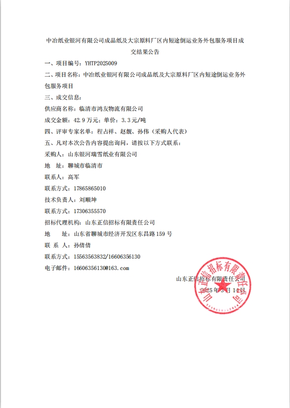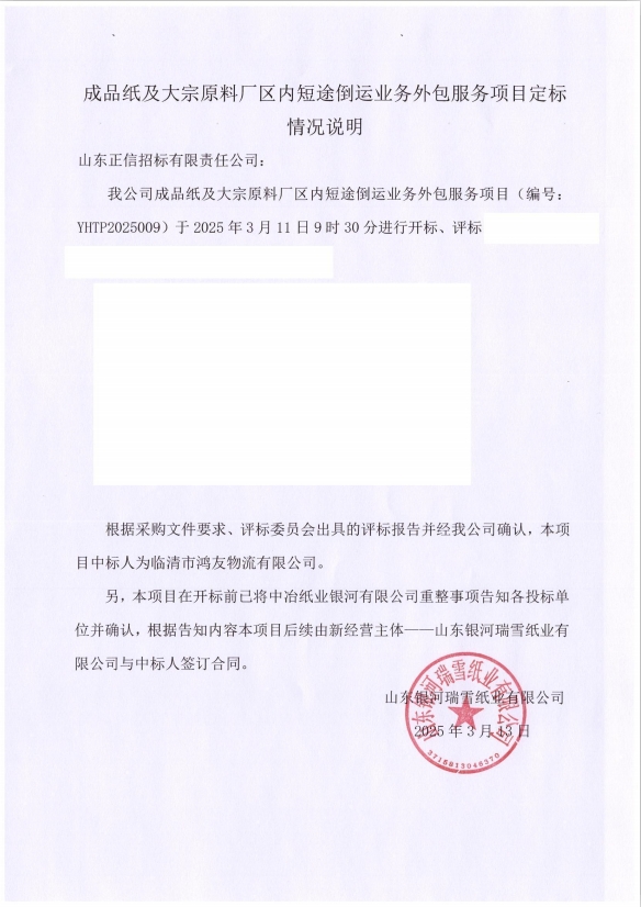 中冶紙業銀河有限公司成品紙及大宗原料廠區內短途倒運業務外包服務項目成 交結果公告