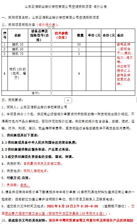 山東正信職業培訓學校有限公司空調采購項目詢價公告