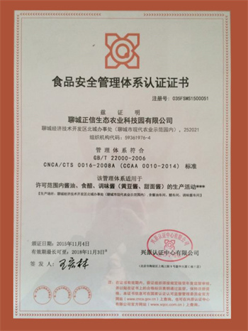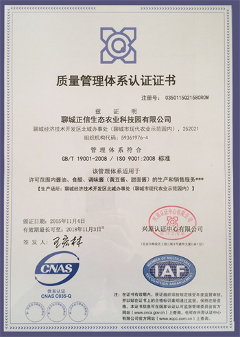 11月份,生態園的質量管理體系認證證書和食品安全管理體系認證證書正式下發。證書自2015年9月份起,已生效。