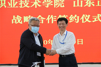 (聊城技術學院黨委副書記、院長徐龍海與正信集團董事長榮長遠雙方簽訂校企戰略合作文件)