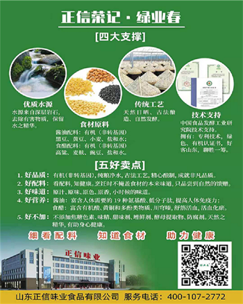 山東正信味業(yè)食品有限公司,位于美麗的江北水城——山東聊城,創(chuàng)建于2013年,廠區(qū)占地面積130畝,項(xiàng)目總投資2.14億元,下設(shè)生產(chǎn)車間、食品檢測(cè)中心、綠業(yè)春廚房養(yǎng)生堂、江北釀造文化博物館,是集生產(chǎn)、銷售、研發(fā)、食品檢測(cè)、旅游觀光為一體的大型專業(yè)調(diào)味品綜合生產(chǎn)企業(yè)。