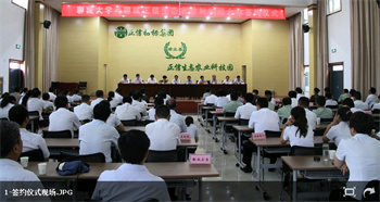 本次活動由聊城經濟技術開發區黨工委副書記金同元主持,會議共分五項議程:一是由聊大服 務社會處處長于會山與生態園總經理王宗鋒簽訂了合作協議書,二是聊城大學生命科學學院院長曹雪松宣讀聊大正信食品研究所運行章程;三是聊城市民政局副局長 竇淑芬宣布聊城市聊大正信食品研究所成立;四是由聊城大學副校長孫蘭雨、聊城經濟開發區黨工委書記、主任楊廣平、聊城大學服務社會處處長于會山、聊城市經 信委主任劉東昌為研究所成立揭牌;五是由孫蘭雨校長致辭。孫校長在致辭中強調“憑借聊城正信生態農業科技園有限公司在資金、市場和企業管理等方面的雄厚實 力,發揮好聊城大學人才的優勢,打造“兩個平臺”,實現“四個共享”,贏得區域社會的認可,實現自身價值。”